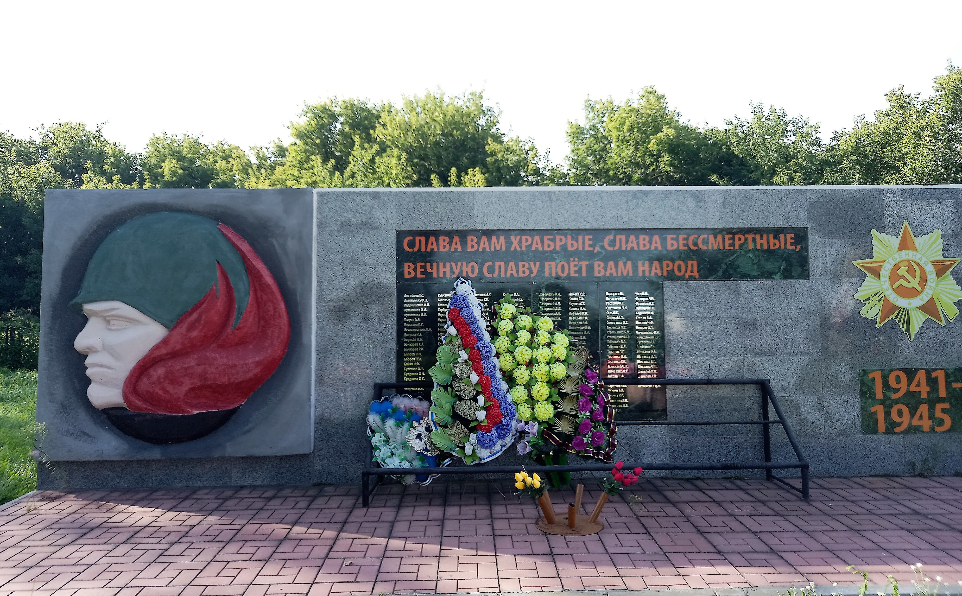 «Слава вам, храбрые! Слава, бессмертные! Вечную славу поет вам народ!». В центре – списки павших за Родину односельчан – всего 198 имен, в правой части – изображение Ордена Отечественной войны.